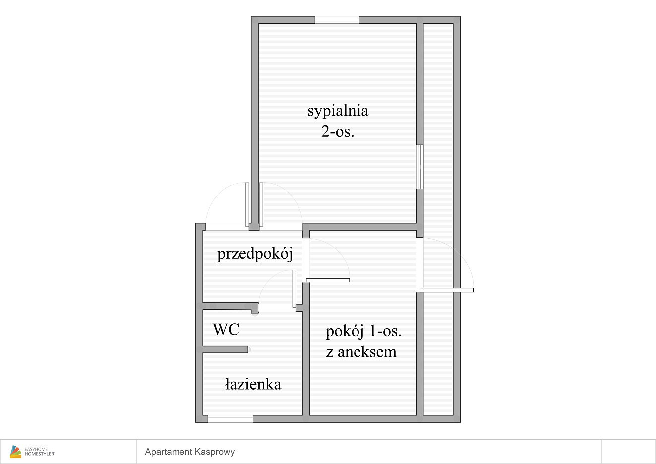 Złożony z pokoju dwuosobowego, jednoosobowego z niewielkim aneksem kuchennym, przedpokoju oraz łazienki.